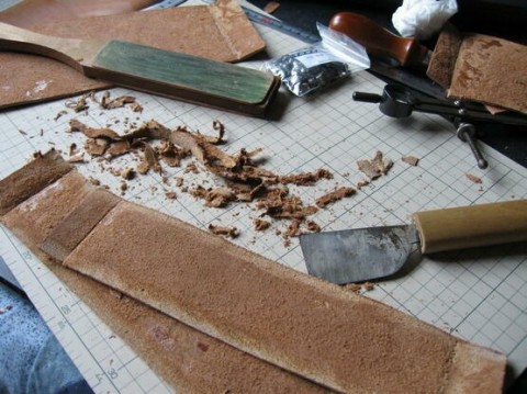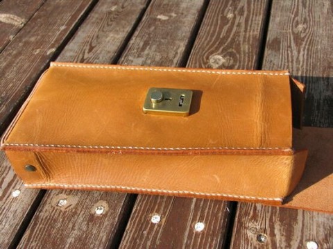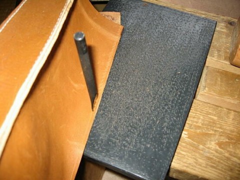 作り方はまず内寸を測って寸法を決める。革は柔軟なので±5?の誤差なんてぜんぜんOKだ。とりあえず上底10cm、下底12cm、厚み5?、高さ20cmくらい(忘れた)と決定。固定方法は下の側面ネジ止めとした。
